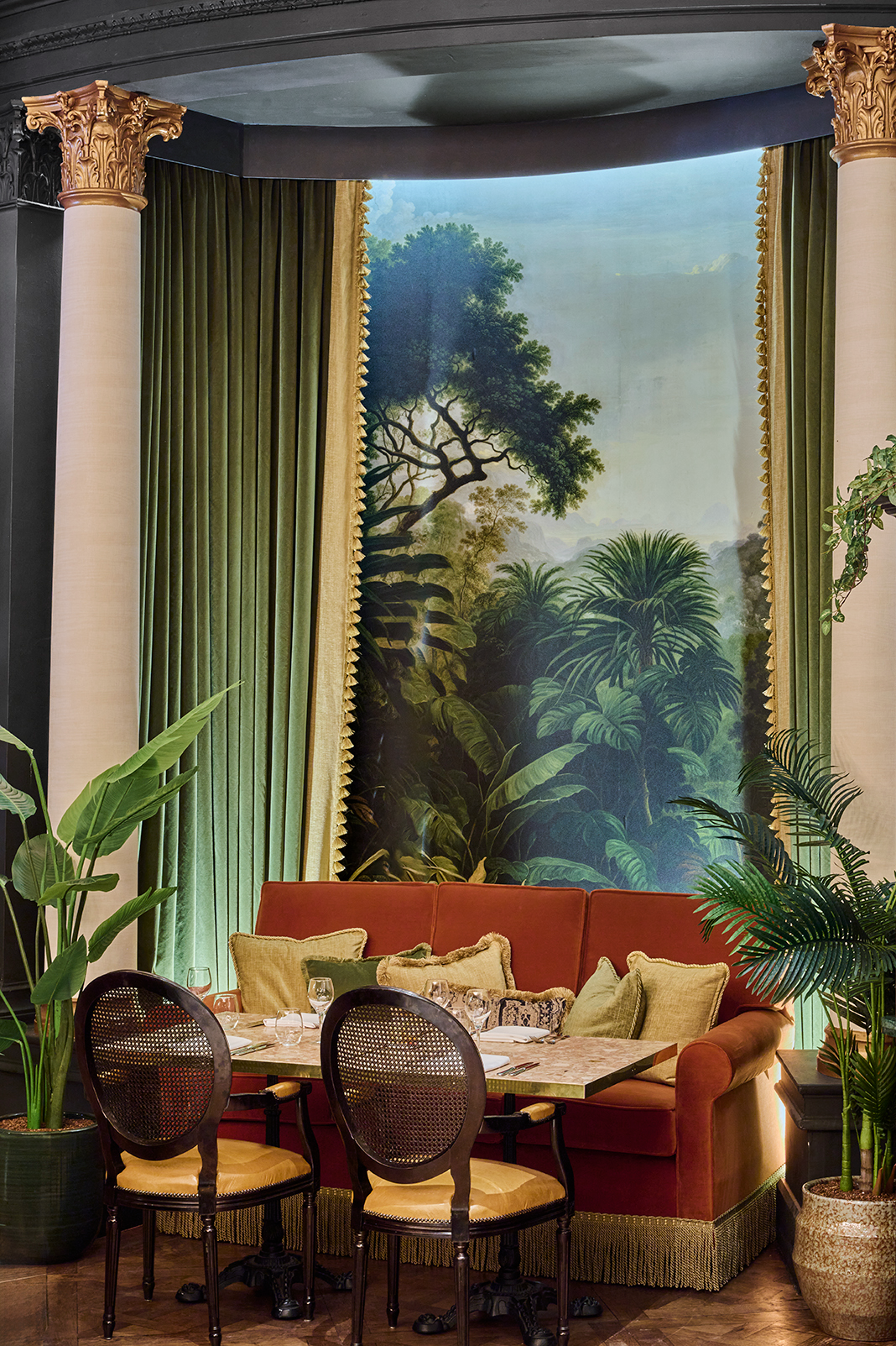 Inspired by historic Indian railways and spice routes, the space evokes the experience of travelling in a luxurious carriage through India’s countryside, celebrating the hotel’s connection to Leeds Station and the golden age of rail travel through high ceilings, baroque accents and a dramatic mural. Operationally, the restaurant was designed to flex seamlessly between hotel breakfast service and Cinnamon Kitchen’s lunch and evening dining. Bespoke free-standing joinery units with tambour-style doors were created to open for breakfast and elegantly conceal hotel equipment during restaurant service, maintaining both efficiency and design integrity.